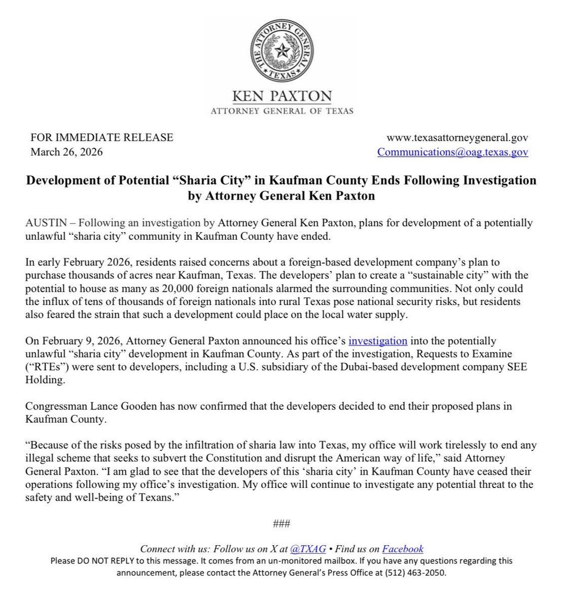 Texas Attorney General Ken Paxton has announced the termination of a controversial development project in Kaufman County, Texas, that had been proposed to house up to 20,000 foreign nationals. The project, often referred to in media reports as a “Sharia city,” was placed under scrutiny following concerns raised by state authorities.
